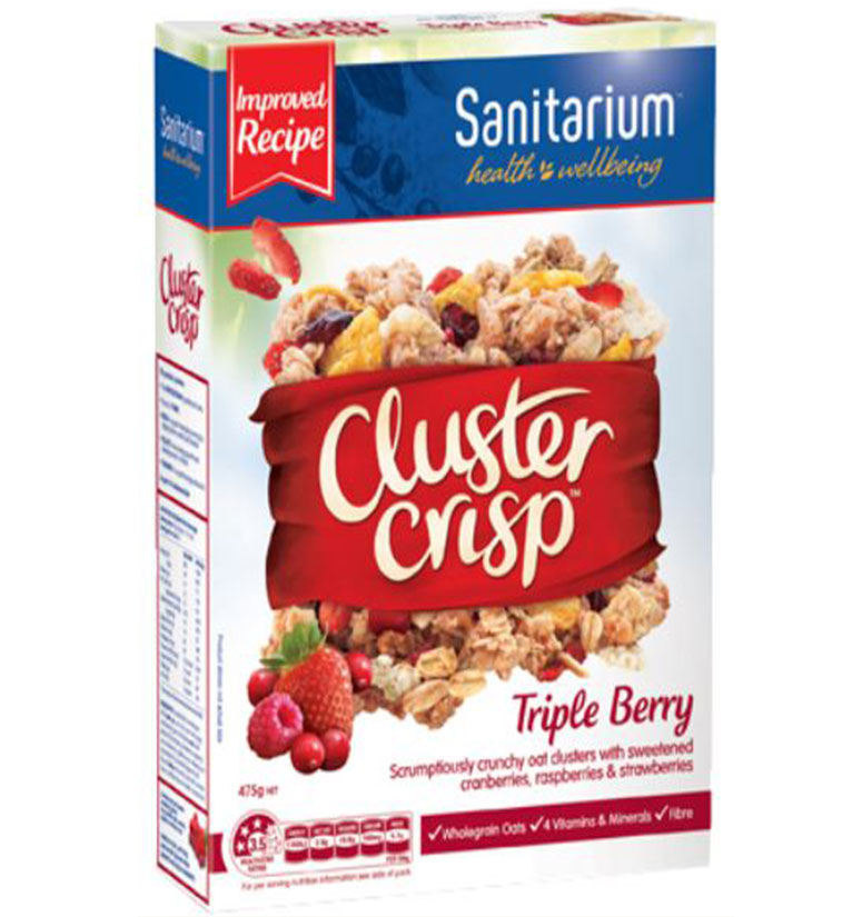 Cereals (68%) [wholegrains (46%) (oats, rye), corn, rice, corn meal], sugar, sunflower oil, palm oil, corn maltodextrin, dried berries (2%) [cranberry, strawberry, raspberry], golden syrup, raspberry juice concentrate (1%), humectant (glycerol), salt, flavour, barley malt extract, acid (citric), vitamins (niacin, riboflavin, thiamin, folate), minerals (iron). Contains cereals containing gluten. May contain milk, sesame, soy, sulphites, lupins, and tree nuts.